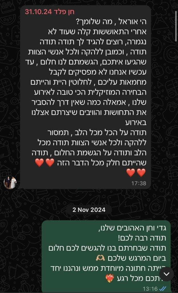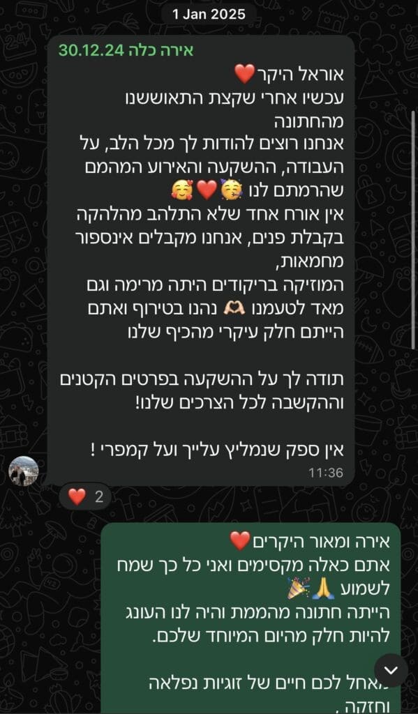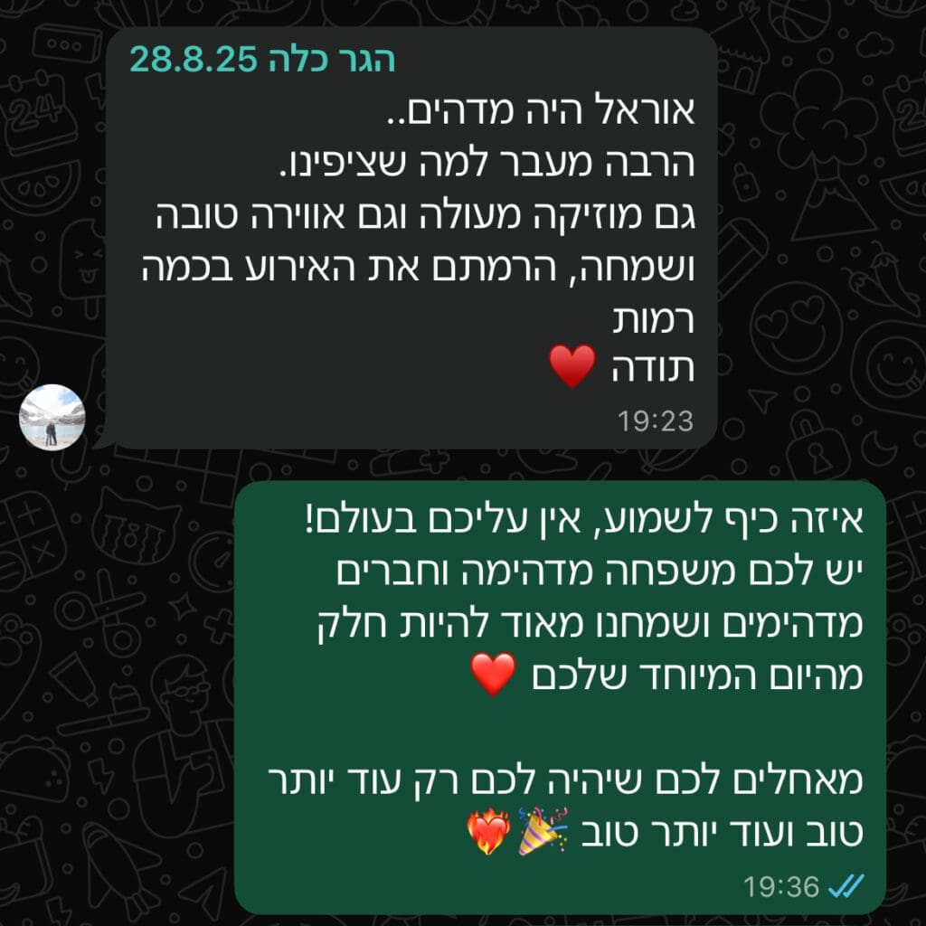תודה לכם ולגמרי ממליצים עליכם לכל מי שמכירים. גל ואיתי ❤️👰♀️🤵♂️