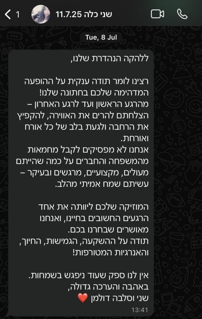 כל מי שדיברנו איתו אחרי החתונה לא הפסיק לשבח את הלקה ואת האוירה שהם הביאו לאירוע